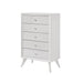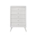 Minimalist and modern, the Cerys chest offers sleek clean lines for a contemporary take. This dresser features five spacious drawers to help you keep an orderly bedroom. Sitting on stylish angled squared wooden tapered legs that provide a modern visual appeal. The white finish makes for the perfect blank canvas for any room.
