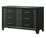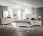 This elegant bedroom collection presents a sophisticated ensemble perfect for creating a refined modern aesthetic in your sleeping quarters. The suite features a sleek, minimalist design with crisp, clean lines and a rich finish that exudes contemporary charm. Anchoring the set is a robust panel bed with a prominent headboard, promising a sturdy and stylish centerpiece. Flanking the bed are complementary case pieces, offering ample storage with their smooth-gliding drawers accented with chic silver-toned hardware.
