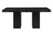 Black Faux marble design with an extra thick top and a double pedestal base with silver connectors. The chairs and channel backed and the legs match the color of the base.