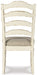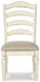 | Details | D743-45: Made of veneers, wood and engineered wood with some cast resin components, Antiqued two-tone finish, Separate extension leaf, Table extends by pulling both ends and dropping in leaf, Seats up to 8, Assembly required, D743-01: Made with wood and engineered wood, Distressed, chipped white finish, Ladderback styling, Polyester upholstery over foam cushioned seat, Assembly required, D743-02: Made with wood and engineered wood, Distressed, chipped white finish, Stylized ribbon back design, Polyester upholstery over foam cushioned seat, Assembly required, | |