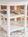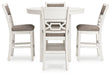 | Details | Includes counter height dining table and 4 counter height bar stools, Table made with rubberwood solids, mindi veneer and MDF substrates, Bar stool made with solid wood frame and engineered wood, White finish, Light gray textured polyester upholstery, Foam seat and back cushions, Backrest with fretwork accent, Bar stool with adjustable levelers; footrest for added support, Table includes 2 display shelves, Seats up to 4, Tapered legs, Assembly required | |