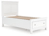 | Details | Includes panel headboard, storage footboard, rails and roll slats , Made with hardwood solids and MDF substrate, Side rails feature laminated solid hardwood slat support rails (or LVL) with glued and screwed blocking for added strength , White painted finish, Round metal drawer knob with satin nickel-tone finish, Tapered feet, Smooth-gliding drawer in footboard , Bed does not require additional foundation/box spring; accommodates most zero clearance adjustable bases with the addition of a bunkie board , Mattress available, sold separately, Assembly required | |