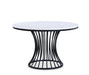 This dining set is a sophisticated blend of contemporary design and artistic flair, ideal for modern homes seeking a touch of elegance. The set features a sleek, round table with a faux marble top that is both beautiful and easy to care for. The table's base is a sculptural marvel, with a dynamic, cage-like structure that is as sturdy as it is stylish. Accompanying the table are plush chairs upholstered in a high-quality, textured fabric, their high backs and cushioned seats offering utmost comfort. The chairs' bold, black frames contrast with the light upholstery, adding a striking visual interest to the set.