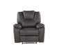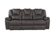 The Katrine Reclining Set showcases the best in manual motion upholstery with this stylish ensemble. Sofa, Loveseat and Chair are covered in a luxurious faux-leather that features baseball stitching, padded armrests and a raised, padded headrest that ensure a comfortable view and seat even when fully reclined. All seats are reclined with a quick pull of the outside lever.