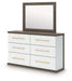 Looking to make a subtly striking statement in your bedroom? We've got you covered. A sophisticated two-tone treatment on this dresser with mirror marries a warm brown finish over replicated walnut grain with a matte white finish. The dresser's rounded corners and thick top radiate an air of modern panache, while sleek handles in a champagne finish add a sparkling touch to the spacious drawers. It’s a master class in contemporary yet comfortable character.