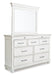| Details | B777B9: Includes king panel headboard, storage bench footboard and rails, Made with solid wood, veneers and engineered wood, Distressed whitewash finish, Foundation/box spring required, sold separately, Mattress available, sold separately, Assembly required, B777B1: Includes dresser and mirror, Made with solid wood, veneers and engineered wood, Distressed whitewash finish, Dark gray pewter-tone finished metal hardware, 7 smooth-gliding drawers, plus 2 small-scaled accessory drawers, Mirror attaches to back of dresser, Assembly required, | |