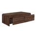 Discover the Mara Storage Cocktail Table, a blend of sturdy construction and eco-friendly materials. Crafted from durable manufactured wood and adorned with environmentally friendly laminate, this table boasts both sustainability and style. With its ample 47" surface area, it offers space for drinks and décor, while two spacious drawers provide convenient storage for reading materials and remotes. The minimalist design, accentuated by curved drawer fronts and waterfall-style tops and sides, lends a modern appeal to any room. Finished in a natural hue, it effortlessly complements a variety of décors, making it a versatile addition to your home. Experience functionality and elegance with the Mara Storage Cocktail Table.