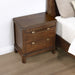 Modern style in a warm brown walnut finish, the Milan Nightstand will make a trusty bedside companion. This piece packs a lot of design in a small footprint with sunburst veneer fronts, a reverse ogee top, and a handy pull-out shelf for glasses or beverage storage. The antique bronze hardware adds additional warmth to this updated take on contemporary design.