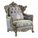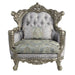 Oozing with elegance and refinement, the Miliani chair makes for an alluring living space. With beautiful scroll legs and shell carvings throughout the trim for a classic touch. The button tufting not only adds a decorative element to the piece but also serves a functional purpose. It helps to secure the padding or cushioning underneath, preventing it from shifting or sagging over time. The nailhead trim accentuates the beauty of any piece of this piece. The two-tone fabrics and bronze finish modernize the traditional style of this chair and gives it an edge. One throw pillow is included.