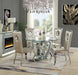 Place this gorgeous Ningbo dining table in any modern setting. The mirrored base durably supports the round clear glass top, which allows the beautiful curves to be highlighted. The panel mirrored base features inlaid faux diamonds that both reflect light and will illuminate your dining space. The matching side chairs are padded with beige leatherette cushions, offering comfort while drawing attention to the elegant chrome finish metal frame.