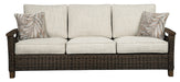 Pretty enough for trendy interiors, yet durable enough to weather the elements, the Paradise Trail outdoor sofa rises to the challenge beautifully. Handwoven resin wicker over rust-proof aluminum merges high style with low maintenance. Rest assured, though the exposed armrests and feet look remarkably like wood, their sturdy aluminum construction is perfectly suited for alfresco living. Plush seat cushions and throw pillows wrapped in high-performing Nuvella® fabric aim to please.
