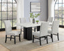 This dining group brings modern sophistication to your dining space with its sleek, contemporary design. The eye-catching marble-like tabletop adds a touch of luxury, perfectly balanced by the sturdy, dark-finished base for a striking contrast. The comfortable, upholstered chairs in a soft, neutral tone complete the ensemble, offering both style and support for your dining experience. Perfect for intimate gatherings or casual dining, this set combines elegance and functionality, making it an ideal centerpiece for your dining room. Its versatile design effortlessly complements a range of decor styles, ensuring it fits seamlessly into any home.