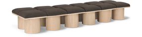 Bring valuable seating and remarkable style to your space with this Pavilion boucle fabric bench, an exquisite balance of style and usability for the entryway, bedroom, and beyond. Crafted from oak veneer with a natural finish, this bench has a 4-inch-thick seat cushion that's channel-tufted for a touch of luxury. The bench's columnar bases add a dash of art deco design, making it a captivating focal point in any room.