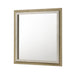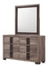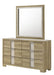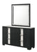 This bedroom set epitomizes modern luxury with its bold finish and striking contrast detailing. The bed’s commanding headboard features a chic marble-like accent and integrated lighting, creating an opulent focal point in the room. Complementary to the bed are the dresser and nightstands, each boasting a sleek silhouette and accented with the same marble finish, lending a cohesive and upscale look. The set's clean lines are softened by the warm undertones of the accent pieces, while the silver hardware on each drawer adds a glint of sophistication.