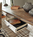 Elevating the art of traditional cottage styling, this L-shaped desk is your heavenly home office realized. Its two-tone finish combines chipped white with distressed wood tone tops for added charm. Framed drawer fronts, decorative corbels and elegantly turned and tapered legs add refinement, while dark bronze-tone knobs lend a classic touch. And this desk is also built for productivity. A spring lift top raises the surface to a comfortable standing position, while the built-in power supply and dual USB ports keep your devices close at hand and ready to go.