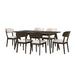 The Piece Mid-Century Modern Wood Dining Set is an ideal blend of style and practicality for your dining space. This set includes a 72" rectangular dining table and chairs, all crafted from solid rubberwood, manufactured woods, and oak veneers for superior stability and longevity. The classic mid-century modern design features a minimalist aesthetic with clean lines, rounded edges, and angled, tapered legs, evoking a timeless elegance. The multi-step walnut brown finish, hand-rubbed with a clear topcoat, highlights the natural beauty of the wood grain. The chairs offer comfortable seating with softly rounded backrests and resilient foam seat cushions wrapped in 100% easy-care polyester fabric. This spacious dining table provides ample room for six, making it perfect for both everyday meals and special gatherings. Enhance your dining experience with this durable and stylish dining collection.