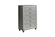 The Riley puts a contemporary spin on old-world style. The luxurious silver finish and mirror accents add sleek, ultramodern touches, while a tufted headboard and footboard echo the traditional style of upscale, craftsman made furniture.