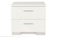 Enhance your bedroom with the Sapphire Modern 2-Drawer Nightstand in high gloss white. Constructed from high-quality manufactured wood, this nightstand features a smooth, ripple-free surface and a glossy white laminate finish for a sleek, contemporary look. The design is highlighted by elongated chrome drawer pulls and silver mylar bases that catch and reflect light, adding a striking modern effect. Inside, the roomy drawers offer ample storage with durable dovetail joinery and smooth full-extension slides for effortless use. This nightstand combines stylish design with practical functionality, making it a perfect addition to any contemporary space.