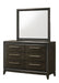 This contemporary bedroom set boasts a sophisticated aesthetic, characterized by its deep espresso finish that speaks to modern tastes. The clean-lined bed features an elegantly tufted headboard, offering both comfort and style, and is complemented by streamlined nightstands and a dresser with a sleek, matching mirror. The brushed metal hardware provides a subtle contrast, highlighting the set’s chic and urbane design.