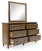 Details B787B5: Includes upholstered headboard, panel rails and bench footboard with slats, Made with hardwood solids, veneers and MDF substrates, Brown finish, Polyester upholstery, Nailhead trim, Turned feet, Foundation/box spring required, sold separately , Mattress available, sold separately, Assembly required, B787B1: Includes dresser and mirror, Made with hardwood solids, veneers and MDF substrates, Brown finish, Oil-rubbed bronze-tone knobs, 6 drawers with fully finished interior, dovetail construction and heavy duty ball-bearing side glides (top drawers felt lined), Turned feet, Mirror attaches to back of dresser, B787-46: Made with hardwood solids, veneers and MDF substrates, Brown finish, Oil-rubbed bronze-tone knobs, 5 drawers with fully finished interior, dovetail construction and heavy duty ball-bearing side glides (top drawer felt lined), Turned feet, B787-93: Made with hardwood solids, veneers and MDF substrates, Brown finish, Oil-rubbed bronze-tone knobs, 2 drawers with fully finished interior, dovetail construction and heavy duty ball-bearing side glides (top drawer felt lined), Turned feet, 110V power supply with USB-A and USB-C charging ports, Power cord included; UL Listed,
