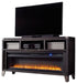 Make watching TV a joy with this large TV stand. Its top surface accommodates TVs up to 70 inches. The stand's rustic-industrial style—with a gray finish, squared edges, zinc-tone corner bracket accents and nailhead detailing—is sure to complement any contemporary decor. Several vented open cubbies offer impressive shelf space, convenient for keeping all of your electronic gear within reach. Handy cutouts keep cords out of sight. For your added viewing pleasure, the wide fireplace insert gives you the cozy feel of a fireplace without the added hassle. With the touch of a button, adjust the temperature and the color-changing flames, and set the timer for long-lasting enjoyment. It comes with faux glass crystals and natural stones, so you can customize the look of the flame bed.