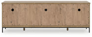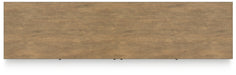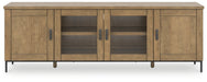 | Details | Made with solid wood frame, birch veneer, MDF substrate and steel, Clean medium brown wood finish, Tubular steel legs with matte black powder coat finish, 2 outside cabinets, each with an adjustable shelf for concealed storage, Center cabinet with inset glass doors and 2 adjustable shelves, Cutouts for cord management, Assembly required | |