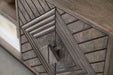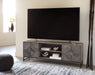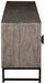 Details Made with wood, Distressed gray finish, Metal base with black finish, Door fronts with diamond pattern, 2 doors with soft-close hinges, 3 shelves, Openings in back for electronics, Assembly required