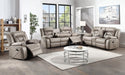 A feature-packed manual reclining set, the Tyson group checks off all the boxes for a living room. A Drop-down center console in the Sofa adds two cupholders, two electrical outlets and two USB charging ports to the center of the room while the Console Loveseat adds a convenient storage place for remotes. Full recline on all pieces is complemented with glider mechanisms in the Loveseat and Chair for incredible comfort when closed. All mechanisms operate with the flick of the rest on the outside control arm.