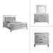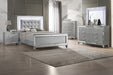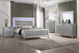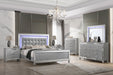 The Valentino Bedroom Set is an opulent collection designed to transform your bedroom into a glamorous retreat. This set includes a bed with touch lighting, a dresser, a lighted mirror, and two nightstands, all meticulously crafted from a durable combination of manufactured and solid woods with decorative embossed inlays for long-lasting quality and distinction. The bed features a crystal button-tufted padded headboard, a gleaming finish, mirrored trims, and alligator embossed inlays, evoking an unparalleled Hollywood glam appeal. Soft LED lighting in the headboard and dresser mirror provides ambient illumination, creating an intimate and luxurious atmosphere. The nine-drawer dresser offers ample storage for clothing, while the three-drawer nightstands conveniently hold your bedside essentials. This exquisite bedroom set combines extravagant style with exceptional craftsmanship, bringing a touch of star quality to your contemporary bedroom suite.