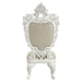 Sophisticated luxury radiates beautifully in the Vanaheim Dining Room Collection. Fabulous floral design with gorgeous details in each piece makes the collection classical and timeless. Antique white finish gives the surface an alluring feel and elegant touch. A clear glass dining table top allows light to filter into and through the whole table, enhancing the collection's overall design. Upholstery side chairs feature elaborate button-tufted design for adding extra style and comfort to the collection. This extremely extravagant style will make any ordinary dining room appear much more unique.