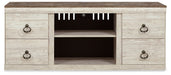 | Details | Made of engineered wood (MDF/particleboard) and decorative laminate, Replicated whitewash worn through paint, Top with replicated wood grained block pattern with authentic touch, Ring pull hardware in antiqued brass-tone finish, Center open storage area; 2 side storage areas with cabinet doors, Cutouts for wire management and ventilation, Compatible with W100-101 LED fireplace insert (sold separately), Assembly required | |